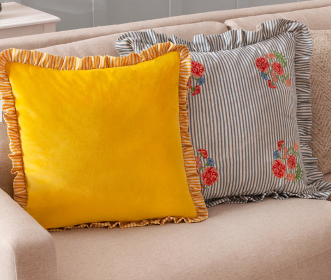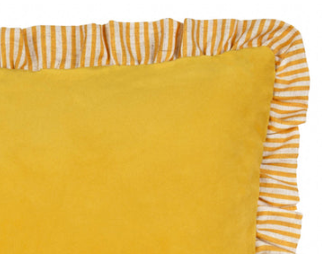 Gorgeous soft yellow velvet cushion with striped ruffle edging. A real treat for the sofa. Handcrafted in the UK with premium materials, this 45x45cm cushion brings warmth and texture to any room. Perfect for gifting or personal indulgence.