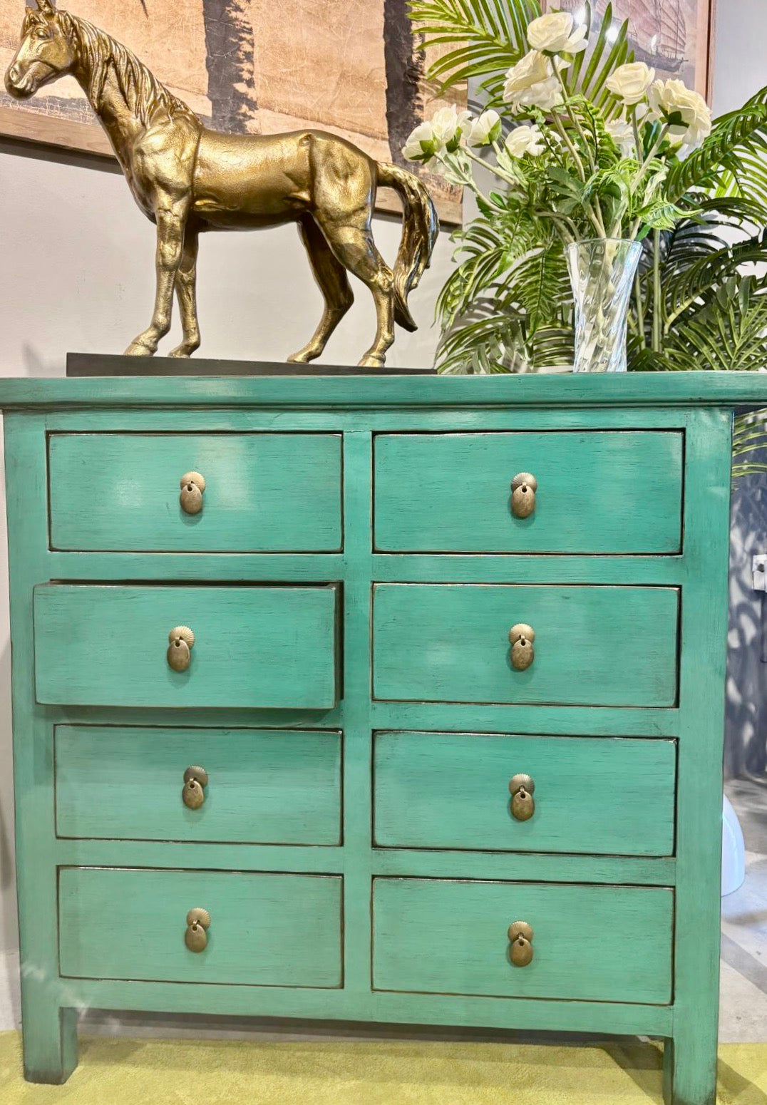 This elegant Chinese elmwood chest features eight generously proportioned drawers finished in a refined painted palette. A versatile statement piece that brings timeless character to bedrooms, living spaces, or studies with its authentic craftsmanship and understated sophistication.