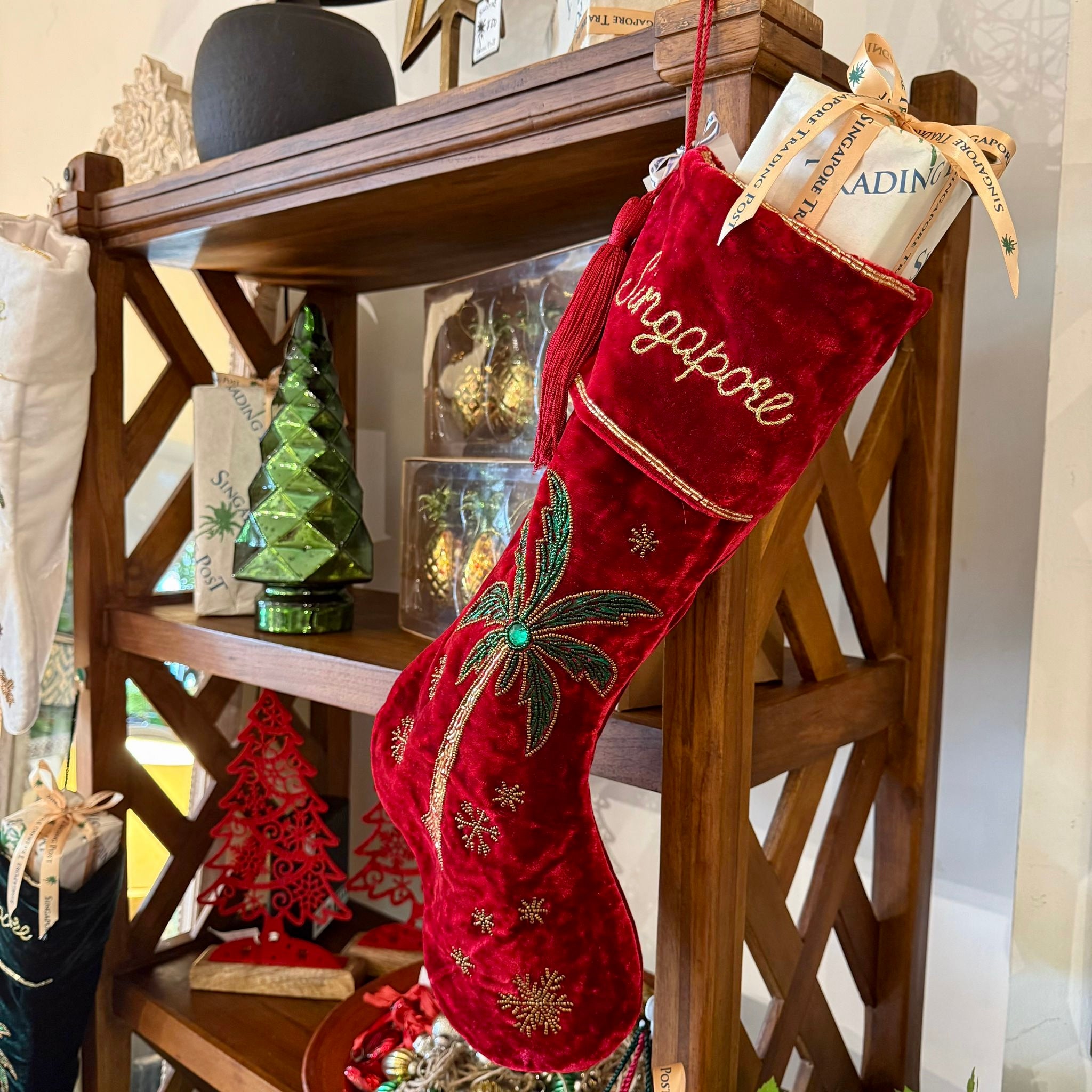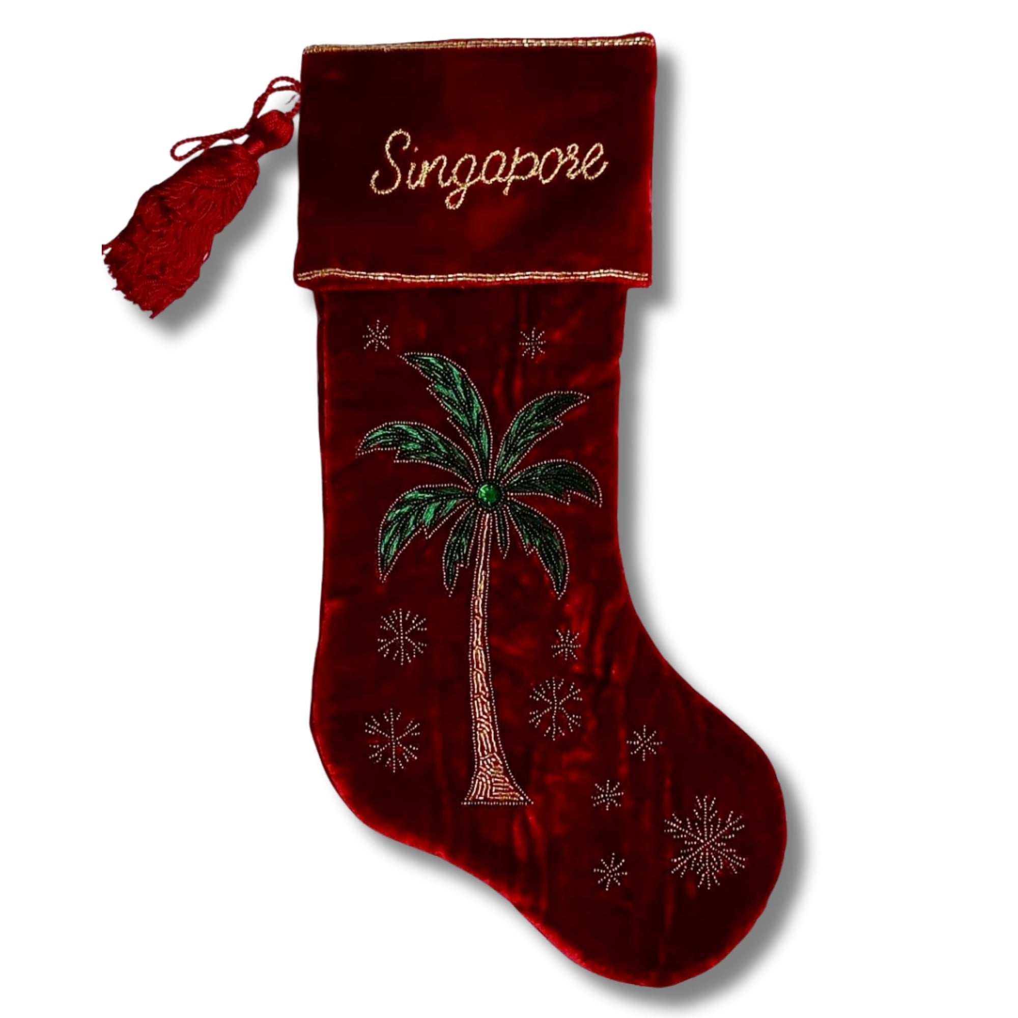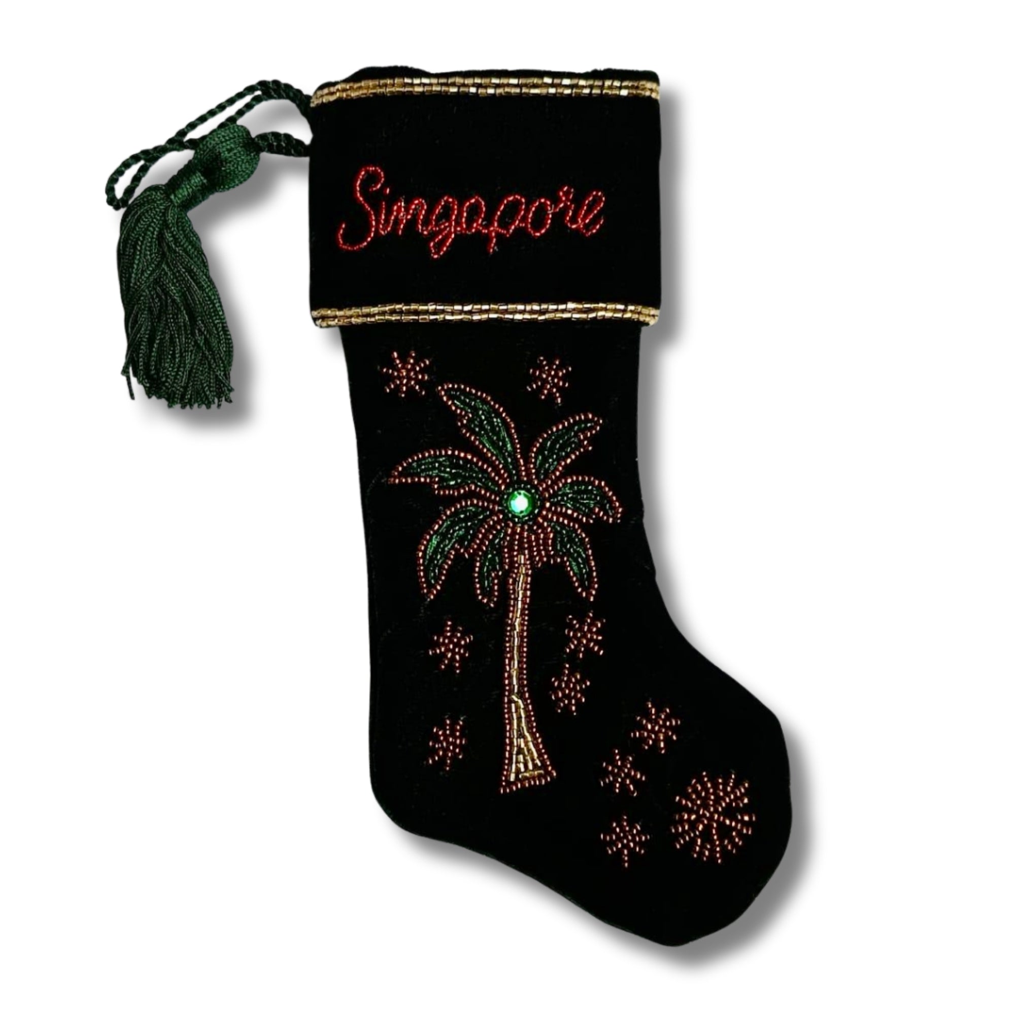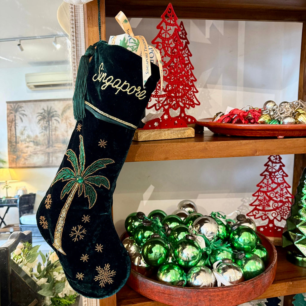 This exquisite Christmas large size stocking features detailed hand beading and is available in two sizes and three colours: green, red, and white. Crafted beadwork by skilled artisans in India exclusively for Singapore Trading Post, it serves as a unique holiday keepsake. A beauty to hang on your mantelpiece.