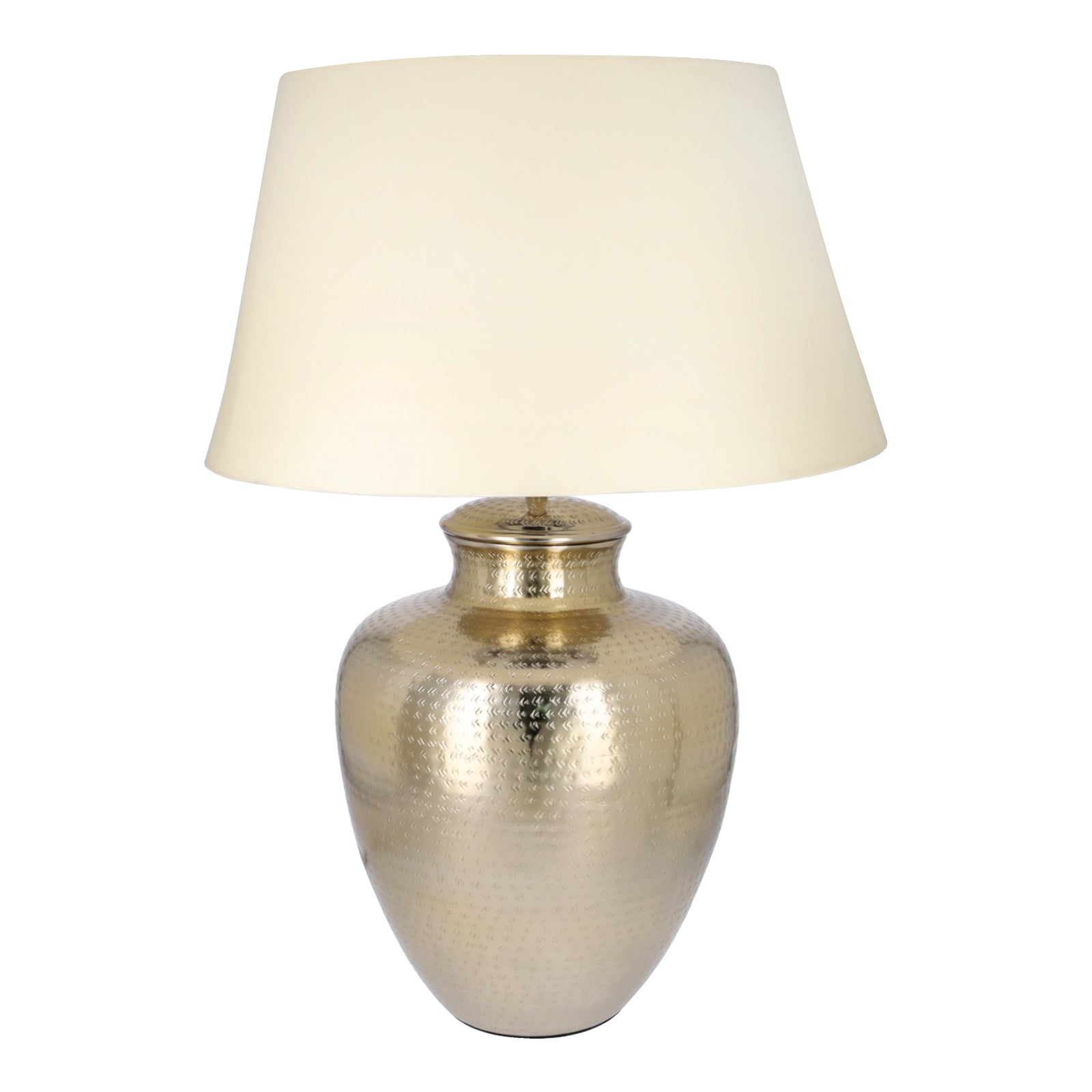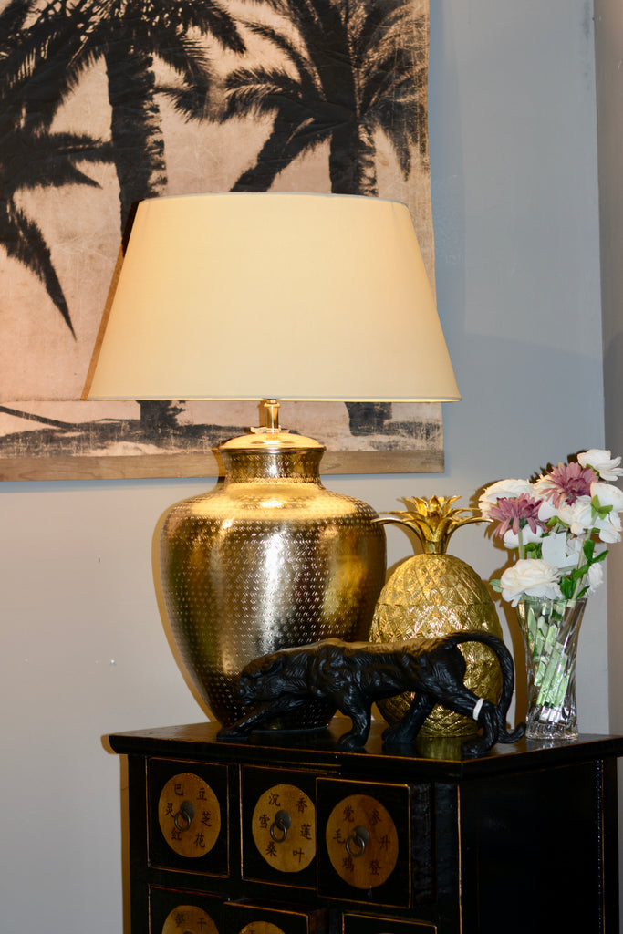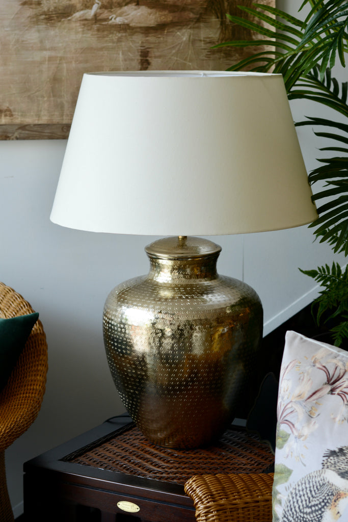 This large grand striking lamp features a metal base with a sophisticated hammered brass finish. Topped with an off-white round shade, it serves as an excellent lighting piece for any sitting room. A statement and imposing piece.