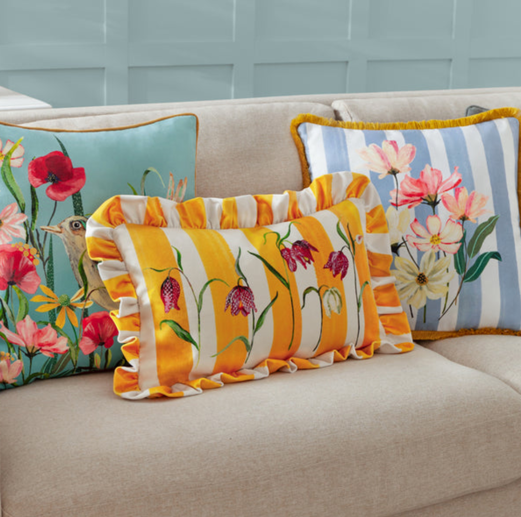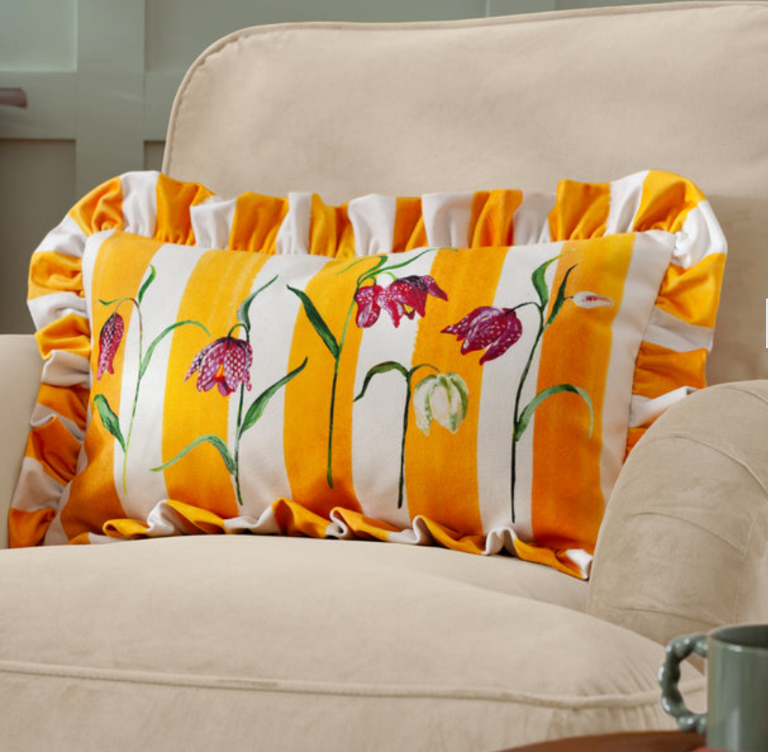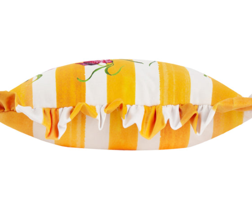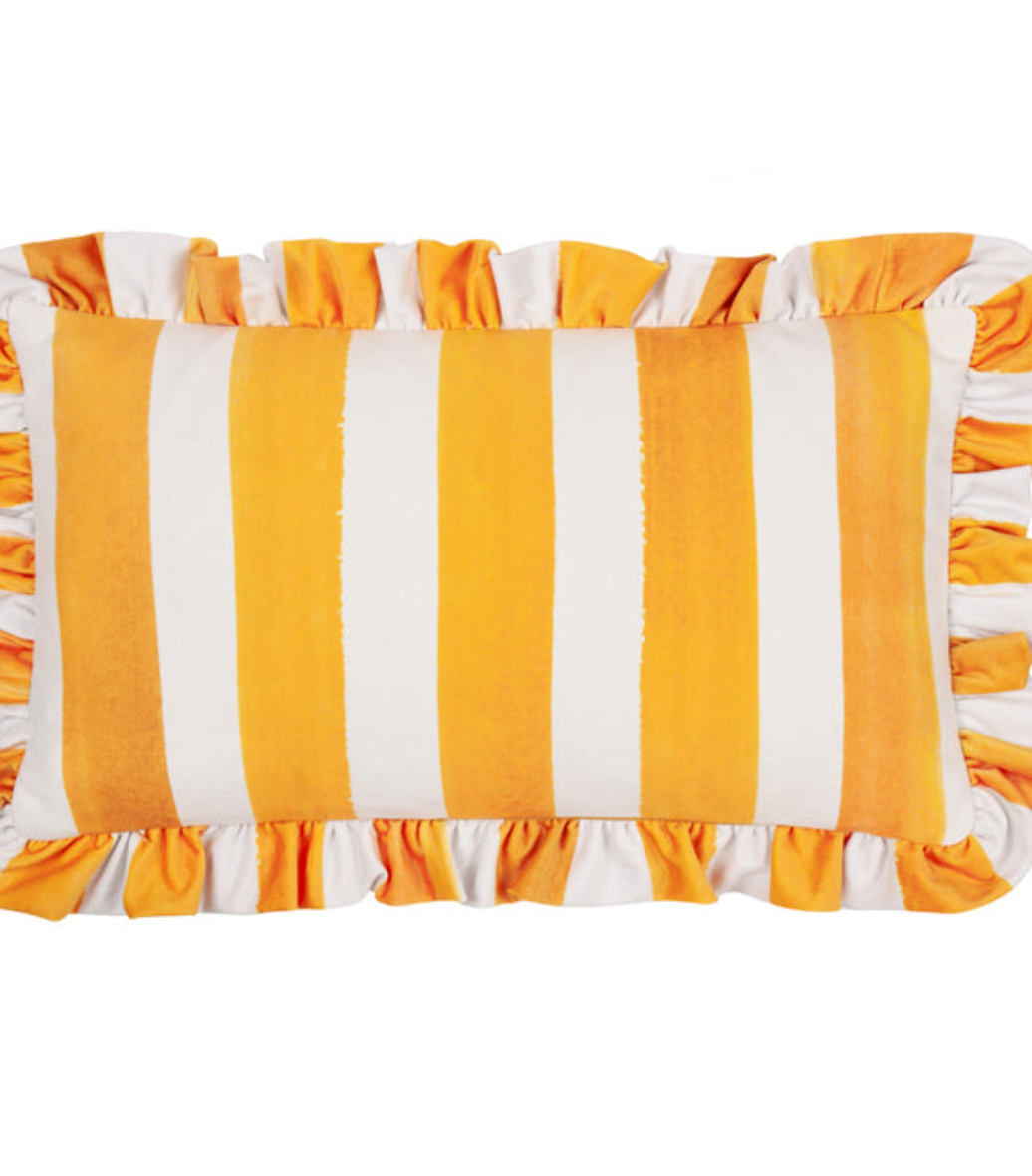 What a lovely fresh pop of colour to lift your home. Striped fabric cushion with a fancy ruffle, available with poly or feather insert. Limited collection from the UK. Dimensions: 30x50cm. Perfect for adding texture and elegance to any room.