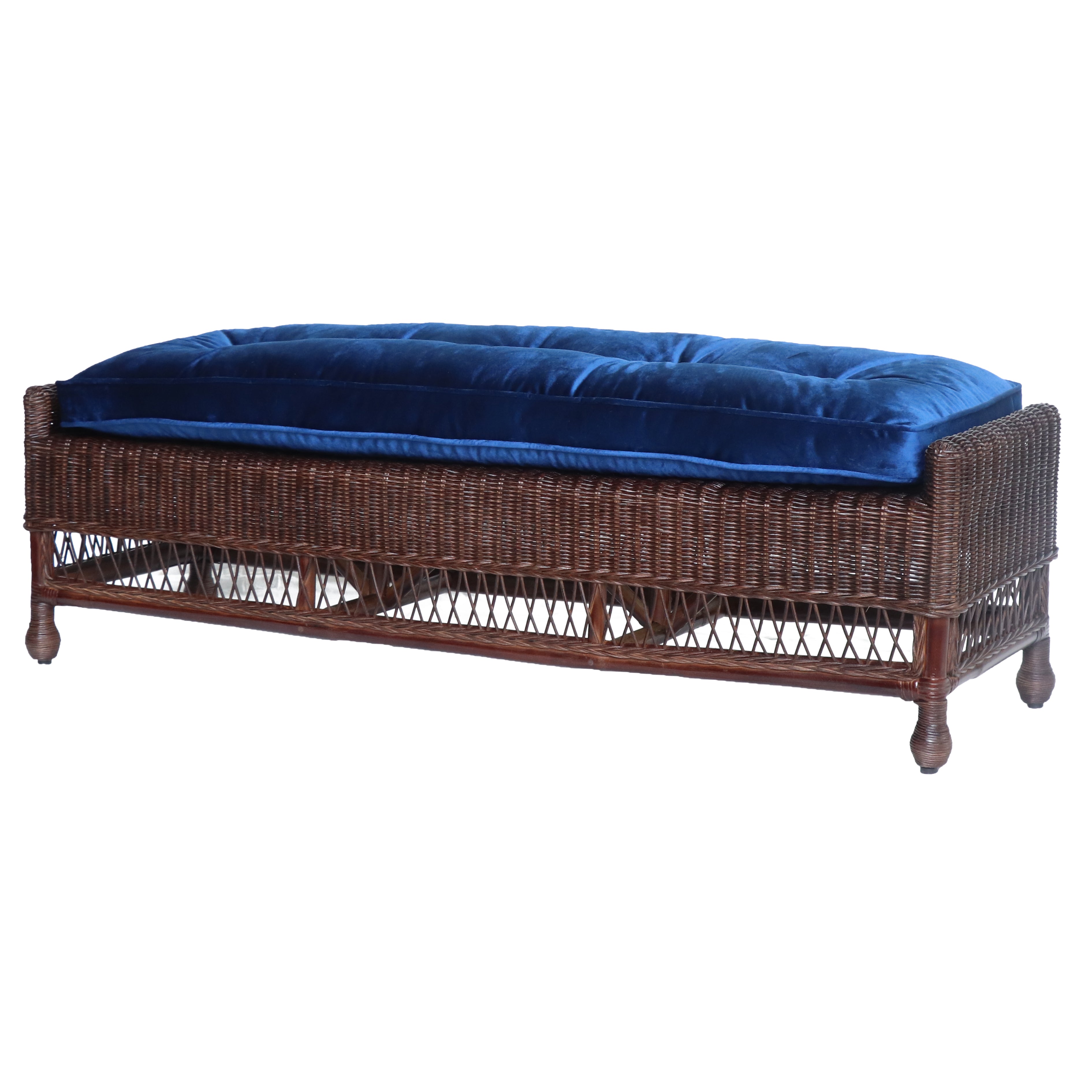 Discover timeless elegance with our Vintage Rattan Bench—a heritage-inspired piece featuring natural dark brown rattan craftsmanship paired with a luxuriously soft velvet pacific blue cushion. This striking combination brings warmth and sophistication to any space. Measuring L150 x H45 x W43 cm and expertly made in Indonesia, it's a statement piece that blends comfort with classic style.